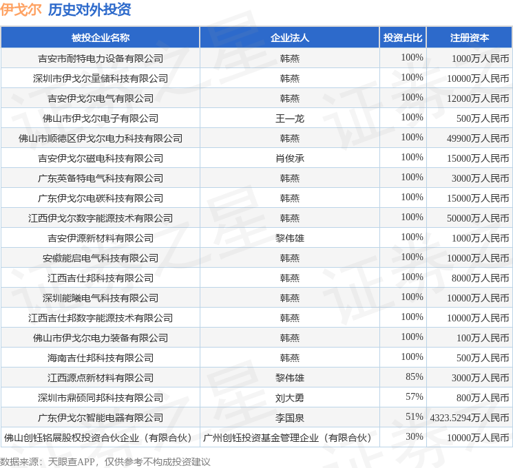 本站消息,根据天眼查APP显示,伊戈尔(002922.SZ)新增一起对外投资事件兴盛网,被投资公司为吉安市耐特电力设备有限公司,法定代表人韩燕,投资占比为100%。该公司从事电气机械和器材制造业,注册资本为1000万人民币。目前,伊戈尔共存在对外投资23项兴盛网,投资占比前20的项目见下表: