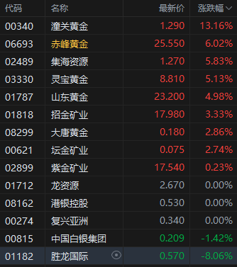5月13日消息,港股黄金股午后走强证星策略,截至发稿,潼关黄金涨超13%,赤峰黄金涨超6%,集海资源、灵宝黄金涨超5%,山东黄金涨近5%。